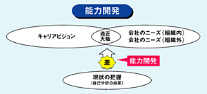 「能力開発」の図を見てください。あなたが自身のキャリアビジョンを認識すれば、おのずと、就職・転職・再就職したい業界や職種が明確になります。採用する側が期待する成果にあなたは100パーセント応えることができるでしょうか。もし少しでも自信がないとすれば、能力開発が必要になります。成果は毎年ハードルが高くなることも考えなければなりません。