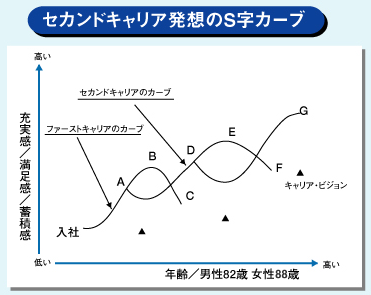 「セカンドキャリア発想のS字カーブ」の図を見てください。あなたは今、AあるいはDの時点にいます。E或いはGがあなたのキャリアビジョンです。就職・転職・再就職があなたの課題です。あなたと、白根陸夫とキャリア・ブレーンの再就職支援事業部で真っ先に確認することはあなたのキャリアビジョンです。次いでそのビジョンを実現するための環境と方策をどうするかを両者で考えることになります。白根陸夫とキャリア ・ブレーン再就職支援事業部はあなたのキャリアビジョンをきるだけ早く、確実に、実現するための方策の探索と実行支援を受け持ちます。「セカンドキャリア発想のS字カーブ」の図では、縦軸に仕事のやりがい(充実感/満足感/蓄積感)、横軸に年齢を尺度としています。右肩上がりのカーブは経験と能力伸長の関係を示しています。